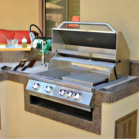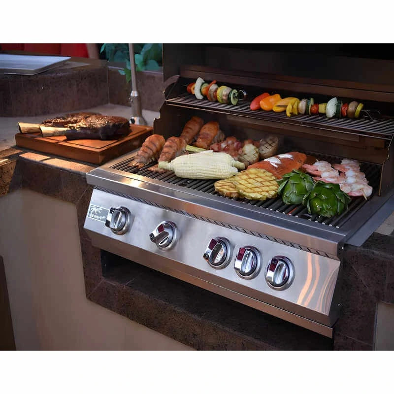 Built for outdoor kitchens, this Kokomo 32-inch 4-burner built-in gas grill combines high-heat performance with infrared rear cooking and a durable 304 stainless build—ideal for consistent results and easy upkeep.