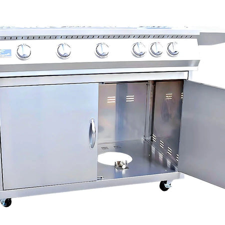 • Full stainless cart with side shelves, propane holder, double doors, and locking casters