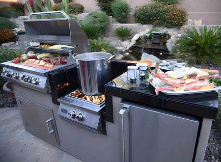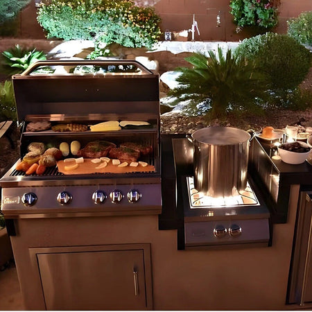 This 7 ft 6 in grill island package is made for real outdoor cooking, not just a pretty patio setup. You get a Pro 32 in 4 burner gas grill for your main cook zone, plus a built in power burner right next to it for sauces, sides, seafood boils, or fast high heat tasks when you are feeding a crowd.