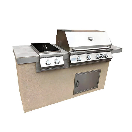 For more flexibility, the island includes a double side burner that lets you boil water, simmer sauces, or sauté vegetables right next to the grill. Below the grill, a 20-inch reversible stainless steel access door gives you a clean storage spot for grill tools and can also work as a gas tank storage area.
