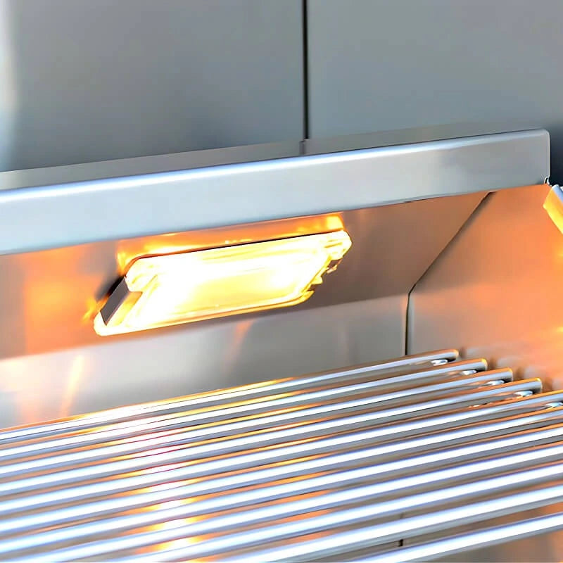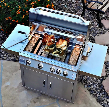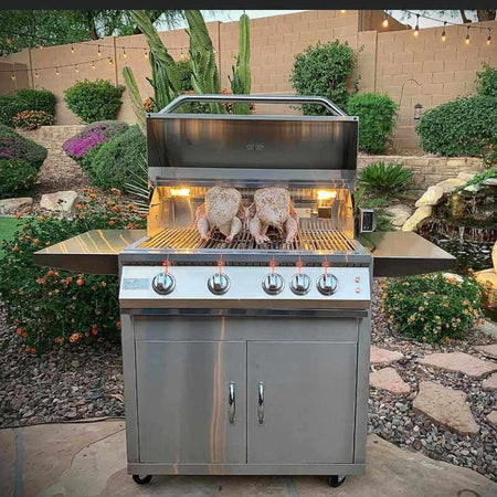 A professional 4 burner grill with cart made for outdoor entertaining—this 32 inch grill delivers steady heat, infrared roasting, and a durable stainless build for reliable results.