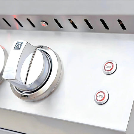 • Halogen lights, SureLight ignition, and red LED knobs for confident day or night grilling