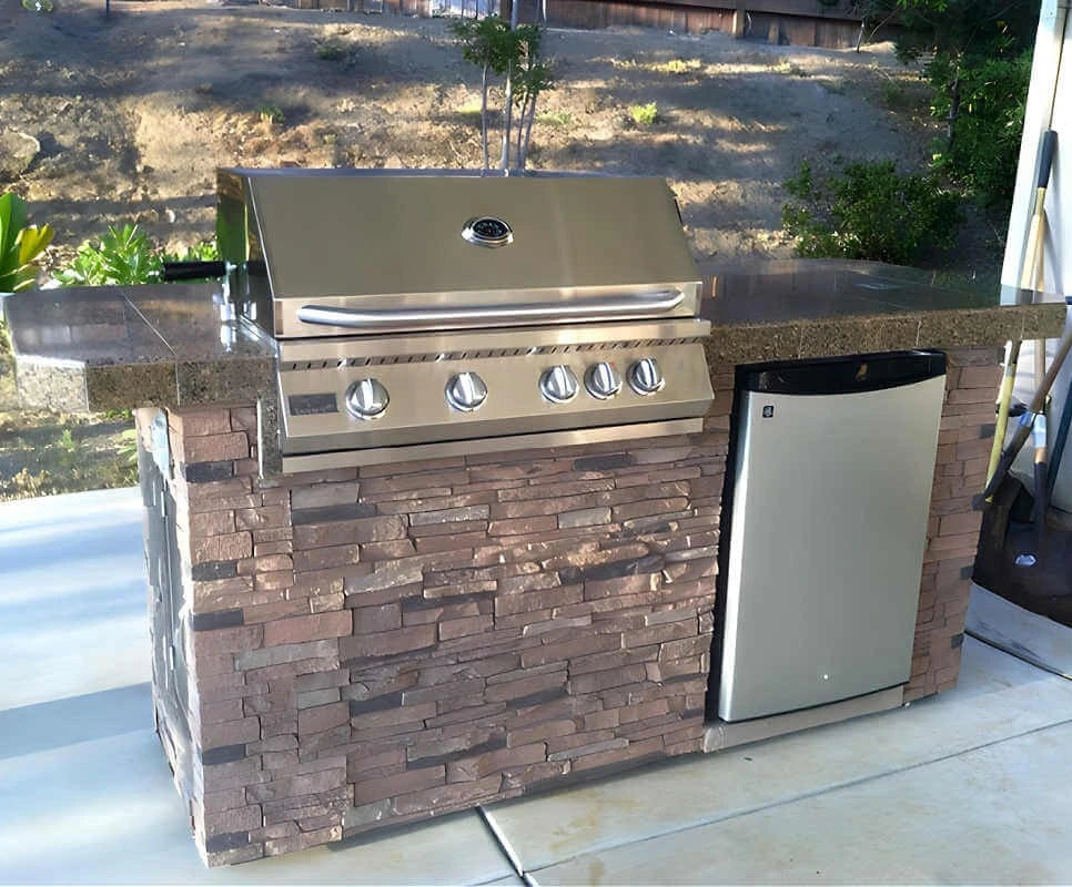 This outdoor kitchen island is built to last with 18 gauge steel framing and non-combustible Hardie backer board, designed to handle heat and moisture without needing grill liners. The island is finished with a stacked stone look cultured stone base and topped with a porcelain tile countertop and backsplash, so you can match the style to your outdoor space.